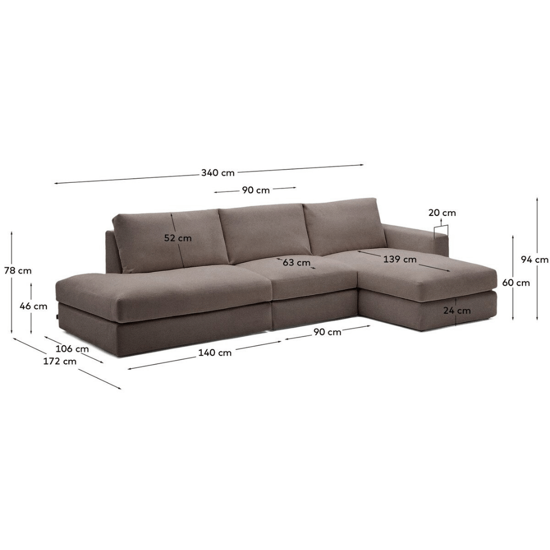 Alea 5 Seater Sofa | Right Hand Chaise | Charcoal Brown