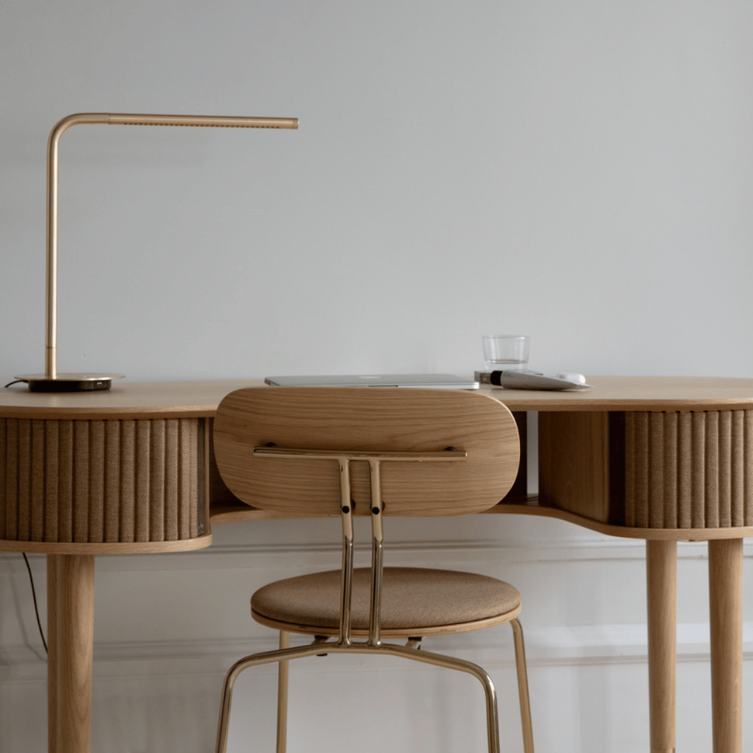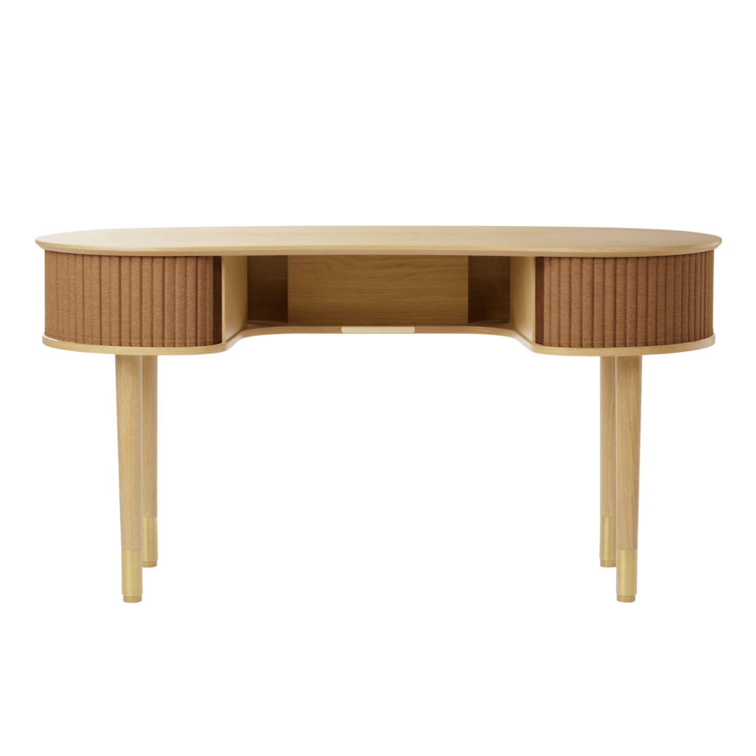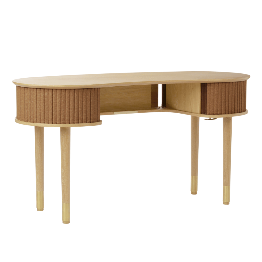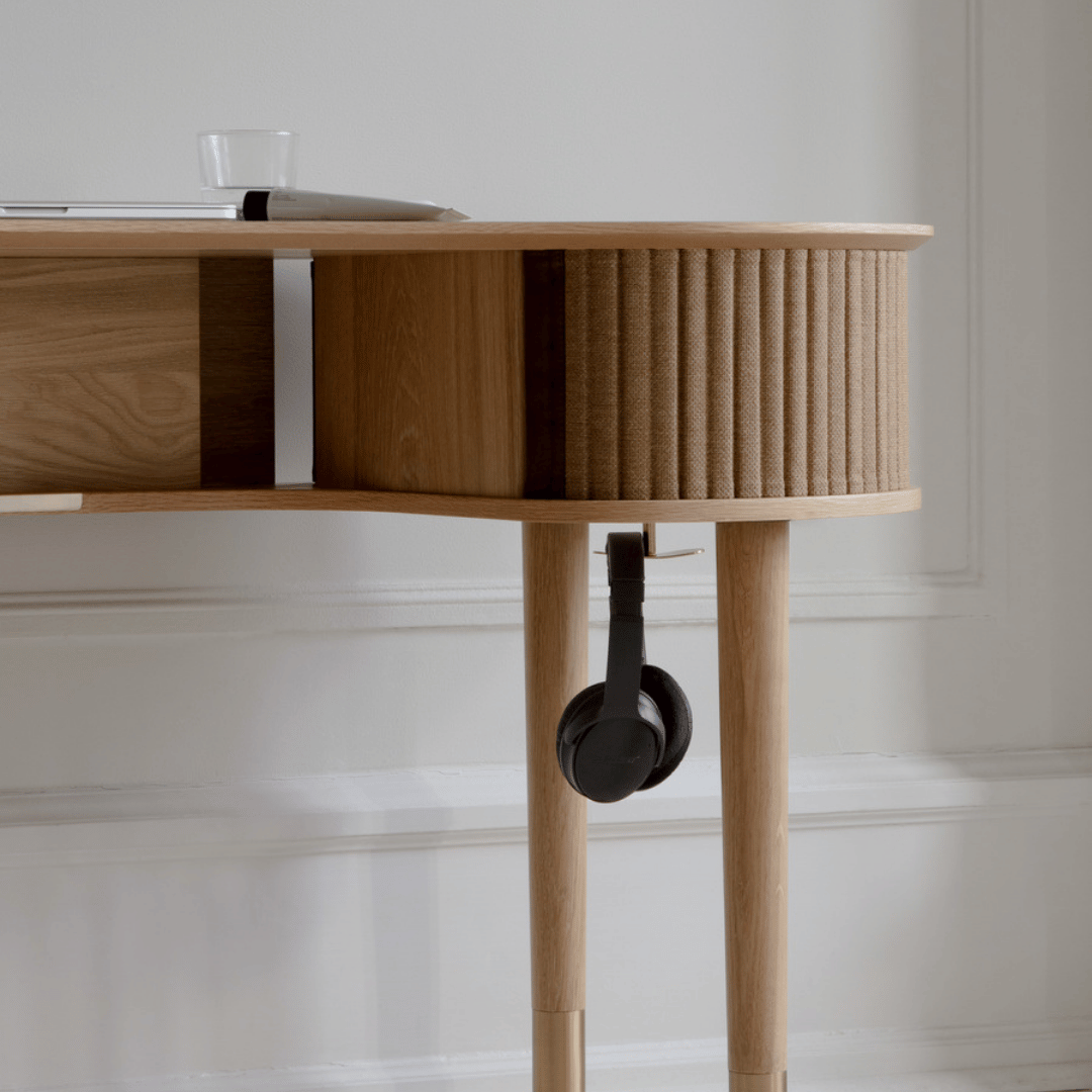 Welcome a timeless design to your home and/or office space with the Audacious desk. Designed to enhance productivity and declutter your workspace, the Audacious will become a welcome piece to any working or studying person. The curved, organic silhouette evokes a true Nordic design, whilst the sliding fabric tambour doors add a touch of nostalgia. A dedicated hook is located under the tabletop to store your headphones, while the back panel conceals all unsightly cords. Built-in desk organisers keep your stationery out of eyesight and neatly tucked away. The leg height can be adjusted to accommodate most office chairs. Please note that the desk does not come with the power bar.