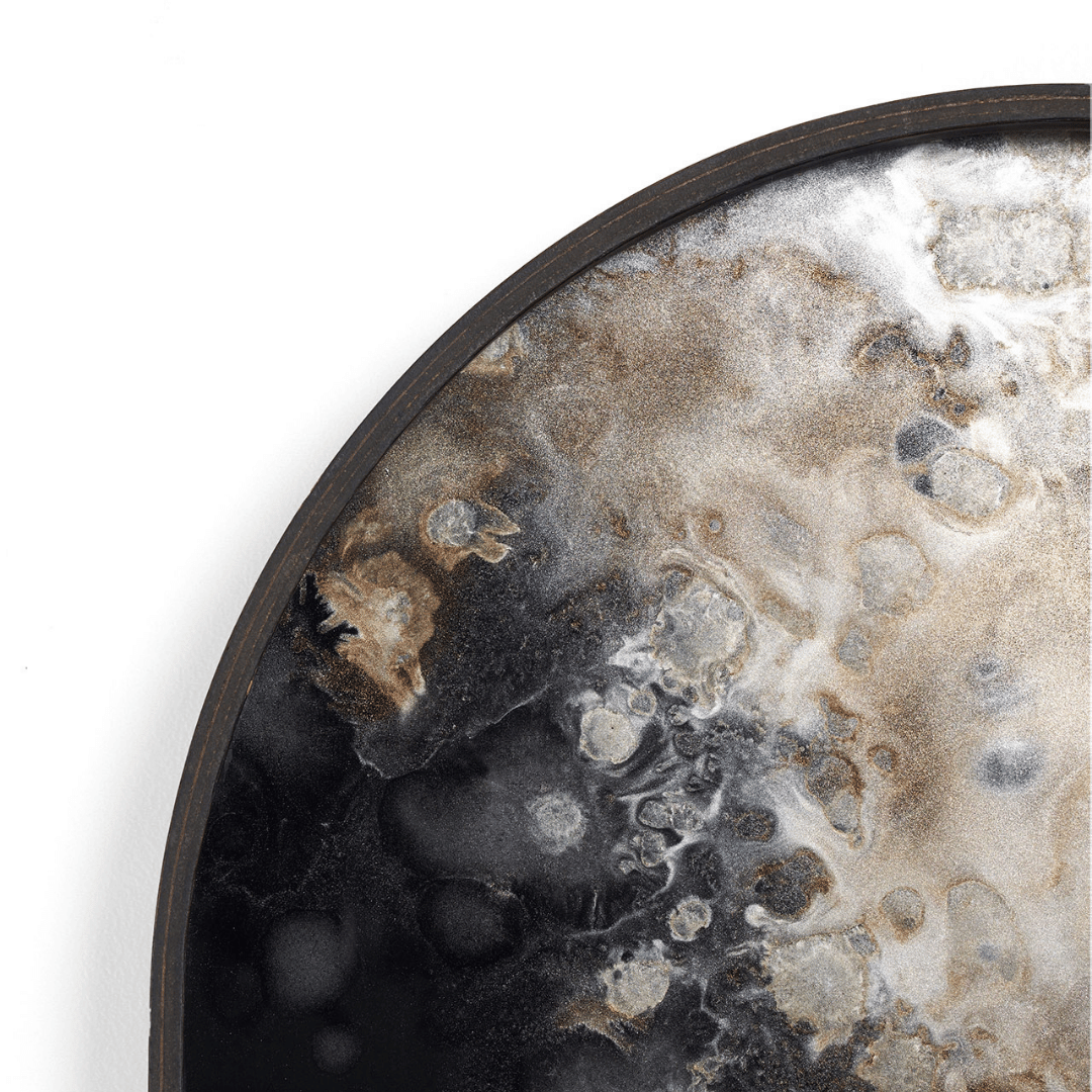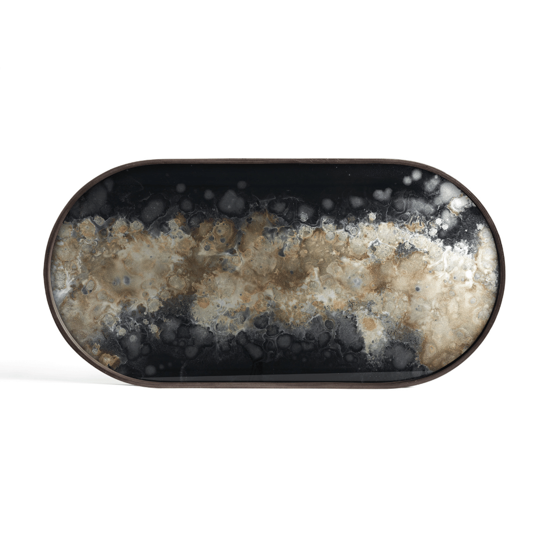 Inspired by nature and organic rock formations, the Black Organic tray features a fluid pattern set in gorgeous, moody colours of champagne, silver and black. Due to the handcrafted nature of these trays, each will differ slightly from the images shown and is considered a sign of uniqueness. Comes beautifully boxed for gift giving. Use it as a statement topper with the Tray oblong side table.