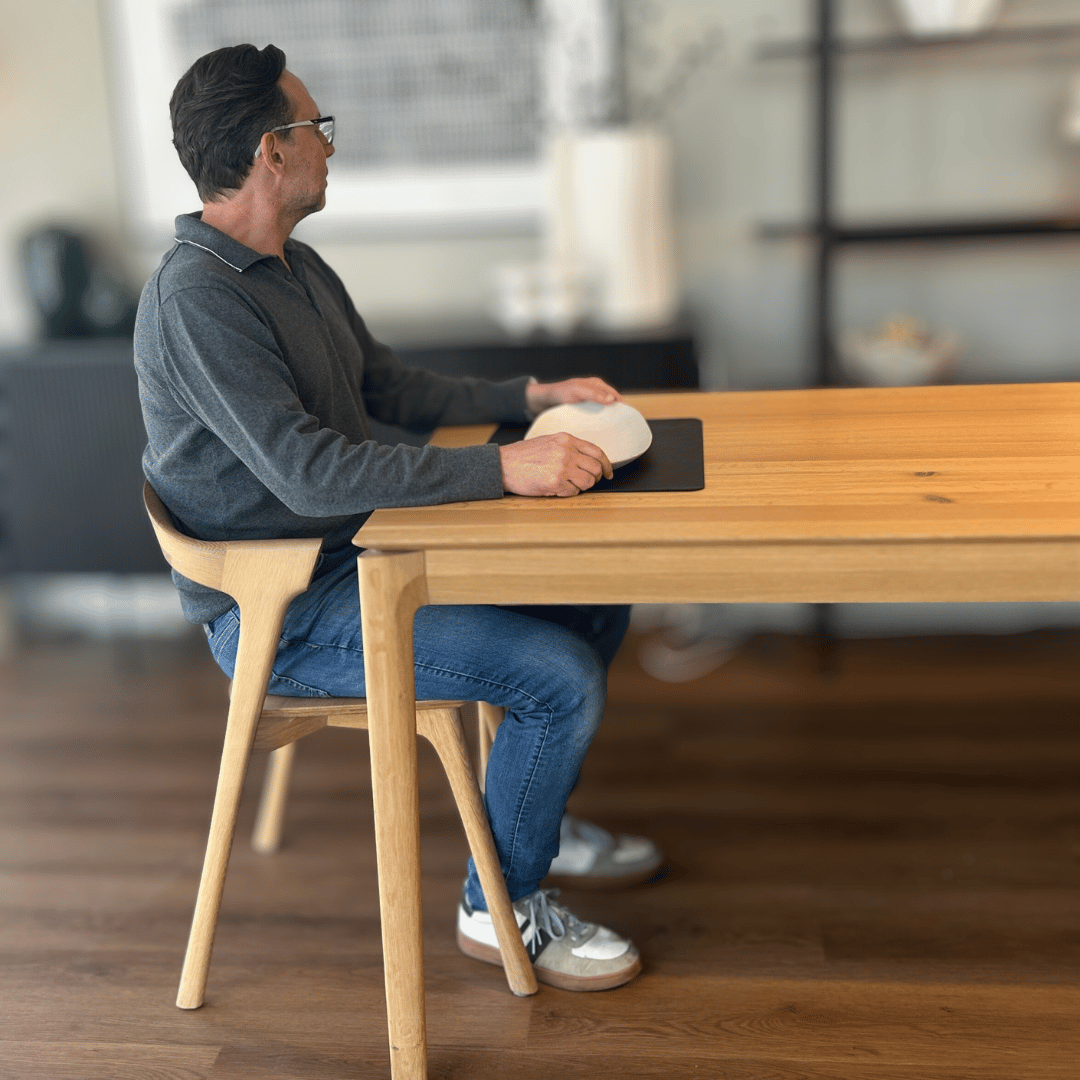 The Oak Bok dining chair is the ideal companion to the Bok dining table series. It will complement any modern or Scandinavian space. The curved arms hug your body for comfort. The attention to detail is showcased through the smooth soft lines and solid build quality. The light tan cognac leather seat is complemented by the light Oak and is finished with hard wax oil to express the individual characteristics of the timber.