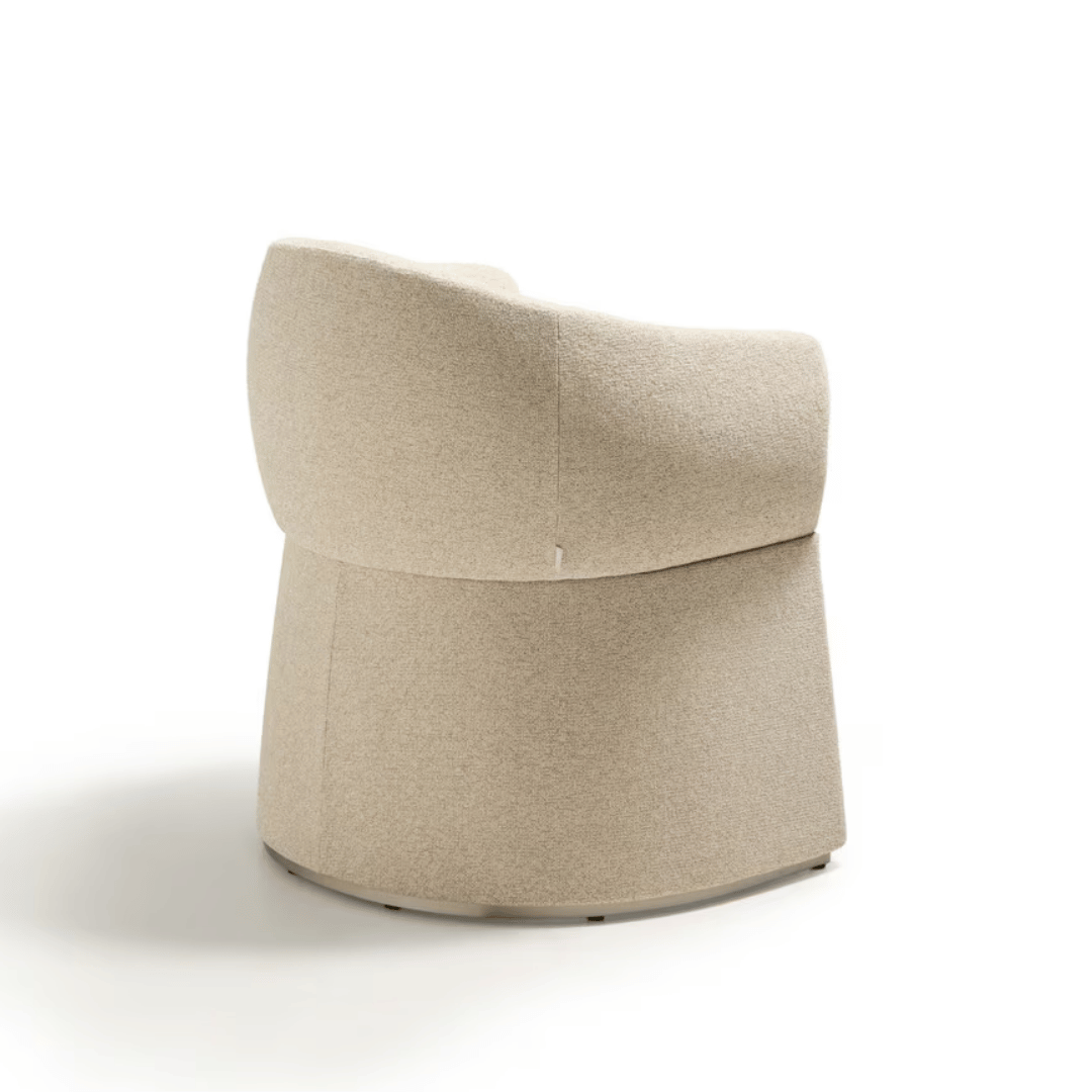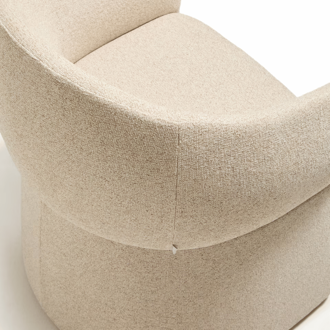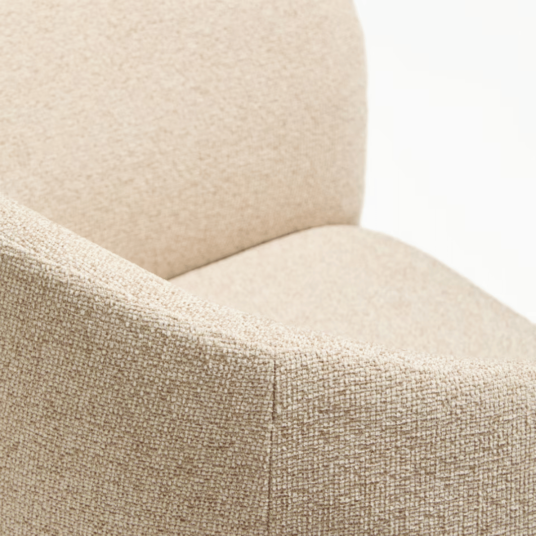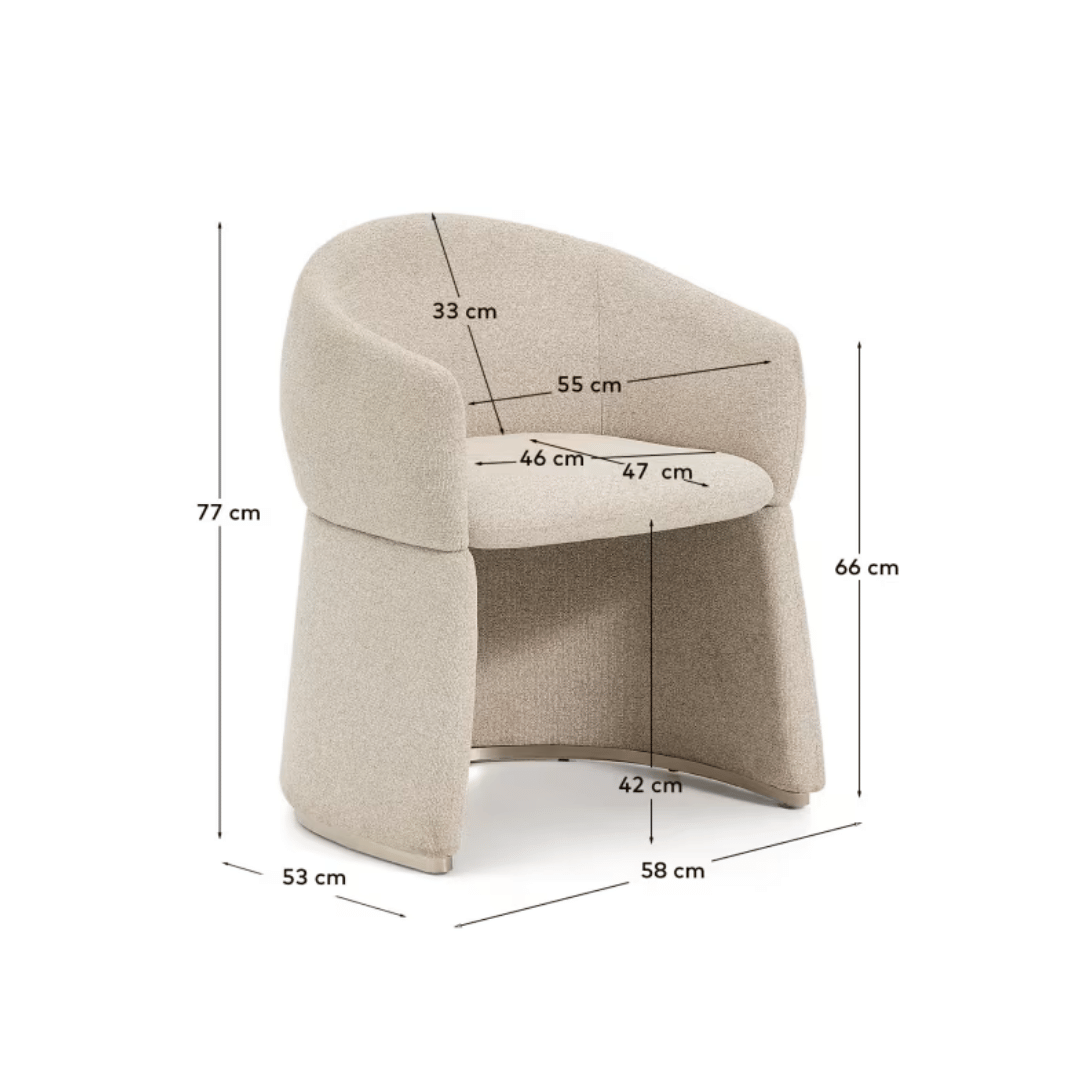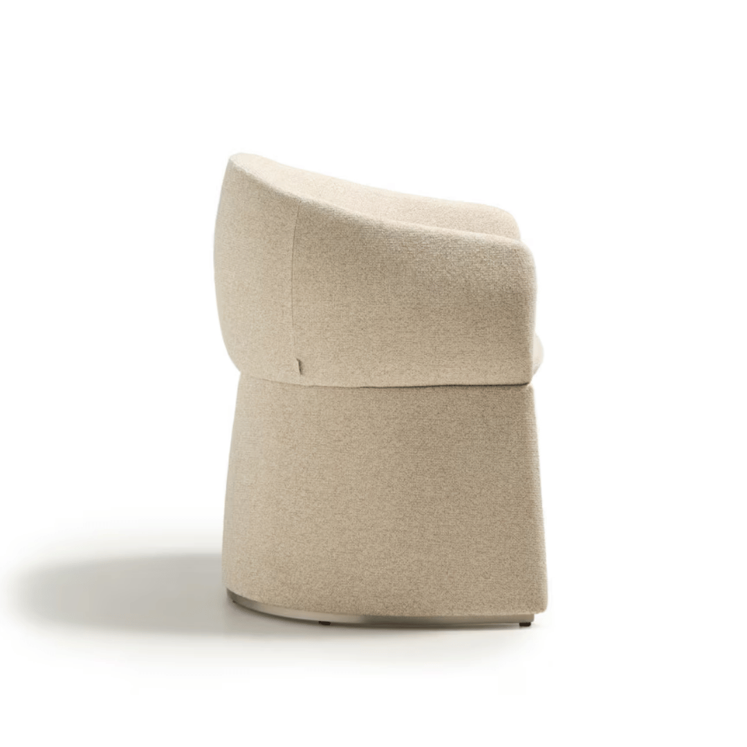 Welcome a sculptural design to your dining space with the Bosca dining chair. Generous proportions and an enveloping shape combine to form a balanced and refined silhouette. The wide, welcoming seat rests on a plywood base with a surrounding metal frame. The oatmeal beige upholstery is made from 100% recycled polyester, being environmentally conscious yet stunning to look at. The medium-firm seat is perfect for entertainment, whilst felt protectors on the feet help prevent marks and scratches on the floor.