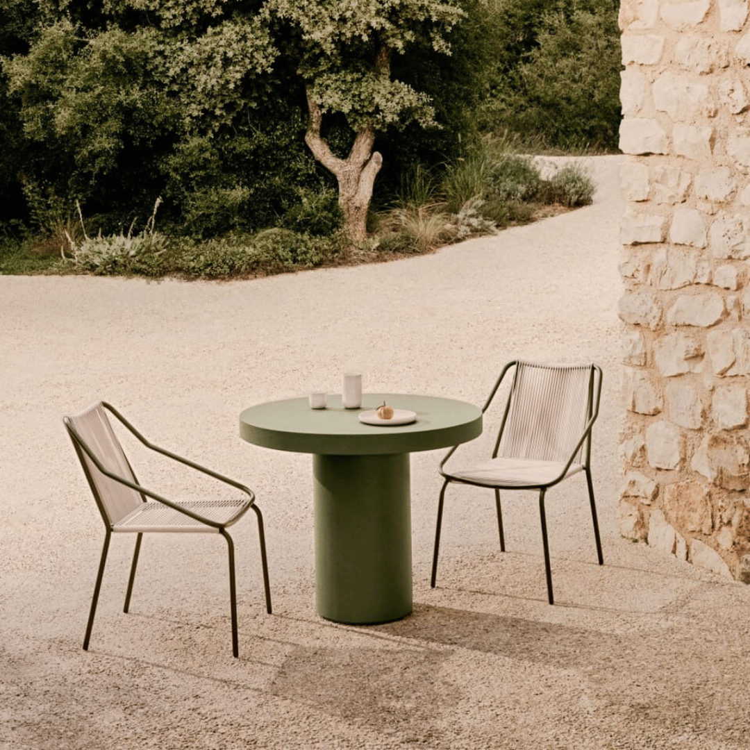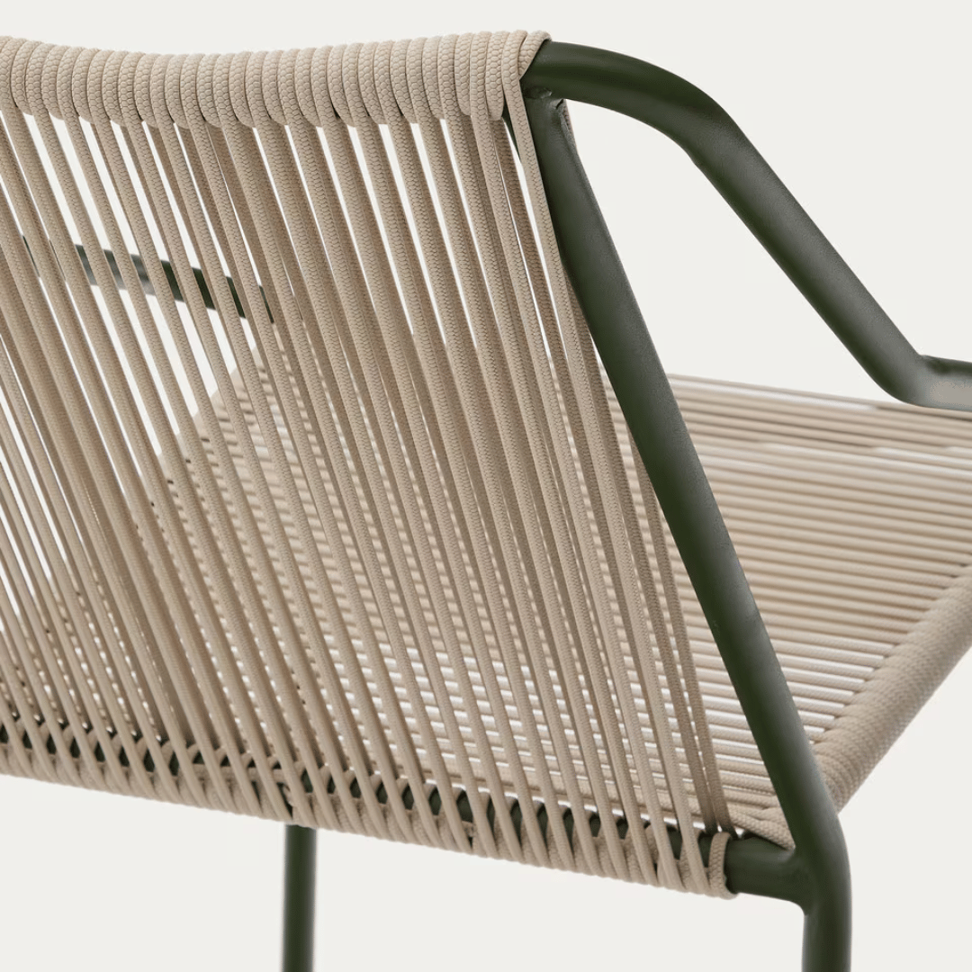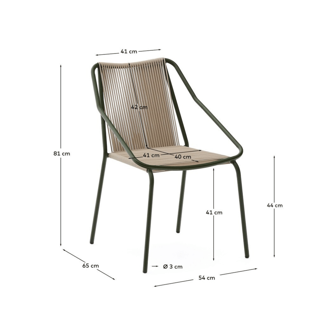 Welcome a minimalist design to your patio area with the Cibi patio dining chair. Made from galvanised steel with a synthetic rope, the Cibi has a superior resistance to abrasion and corrosion - becoming the perfect chair for the Australian elements. The ecru rope is complemented by the dark green steel detailing, combining to create a natural yet industrial aesthetic.