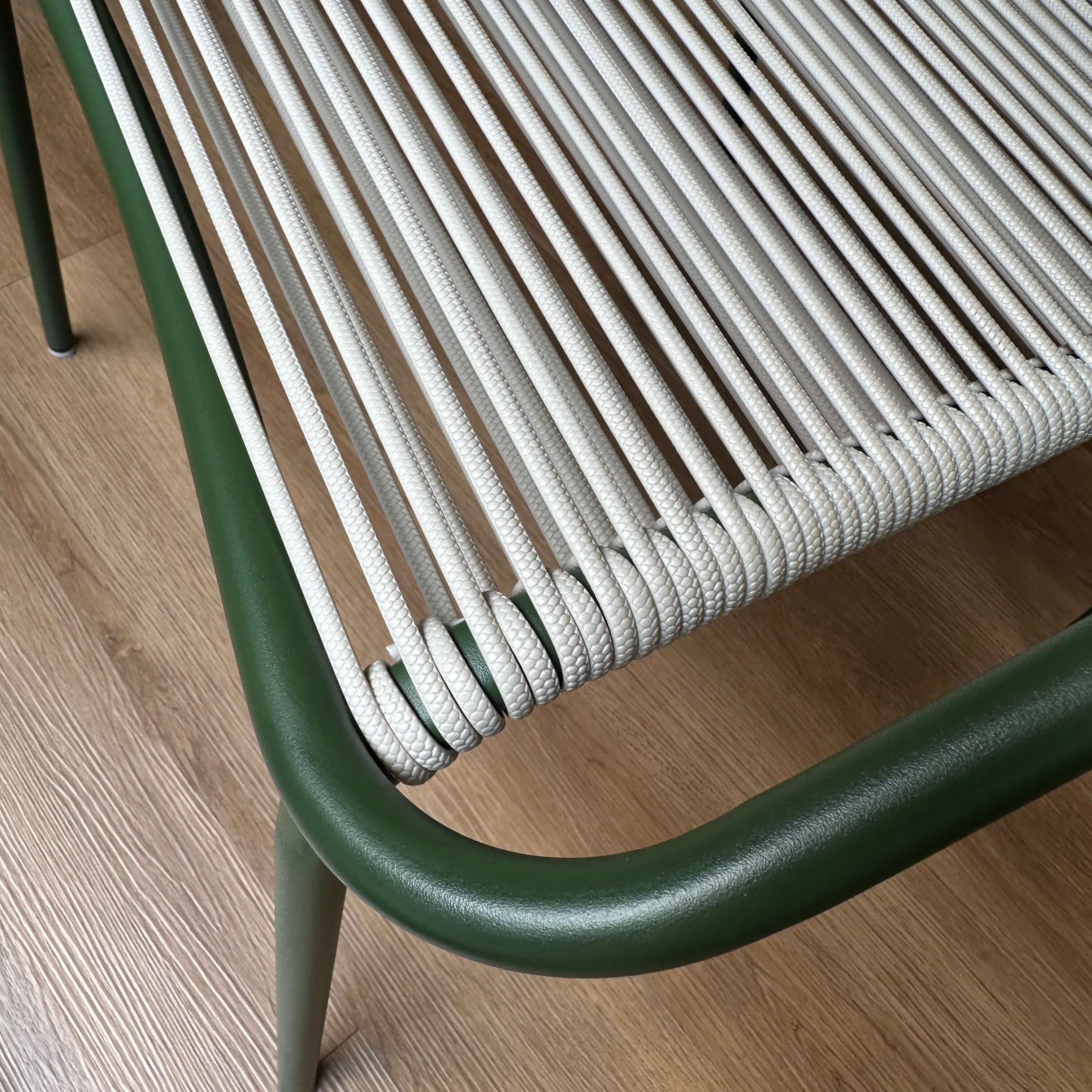 Welcome a minimalist design to your patio area with the Cibi patio dining chair. Made from galvanised steel with a synthetic rope, the Cibi has a superior resistance to abrasion and corrosion - becoming the perfect chair for the Australian elements. The light beige rope on the back and seat is comfortable and allows water to go right through. The ingenious angled arm design makes it sit close to any table with side rails. Stores easily as it is stackable.
