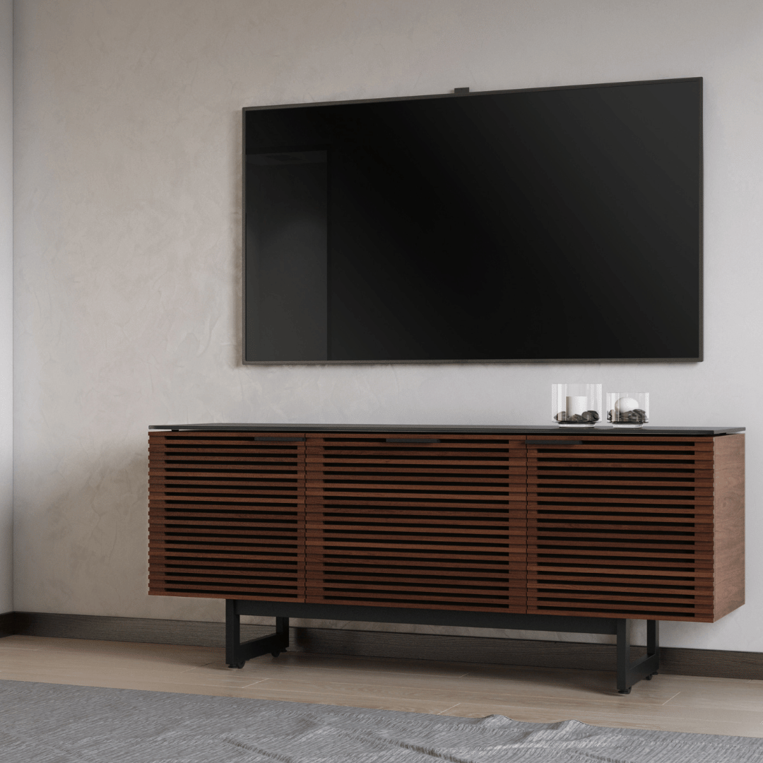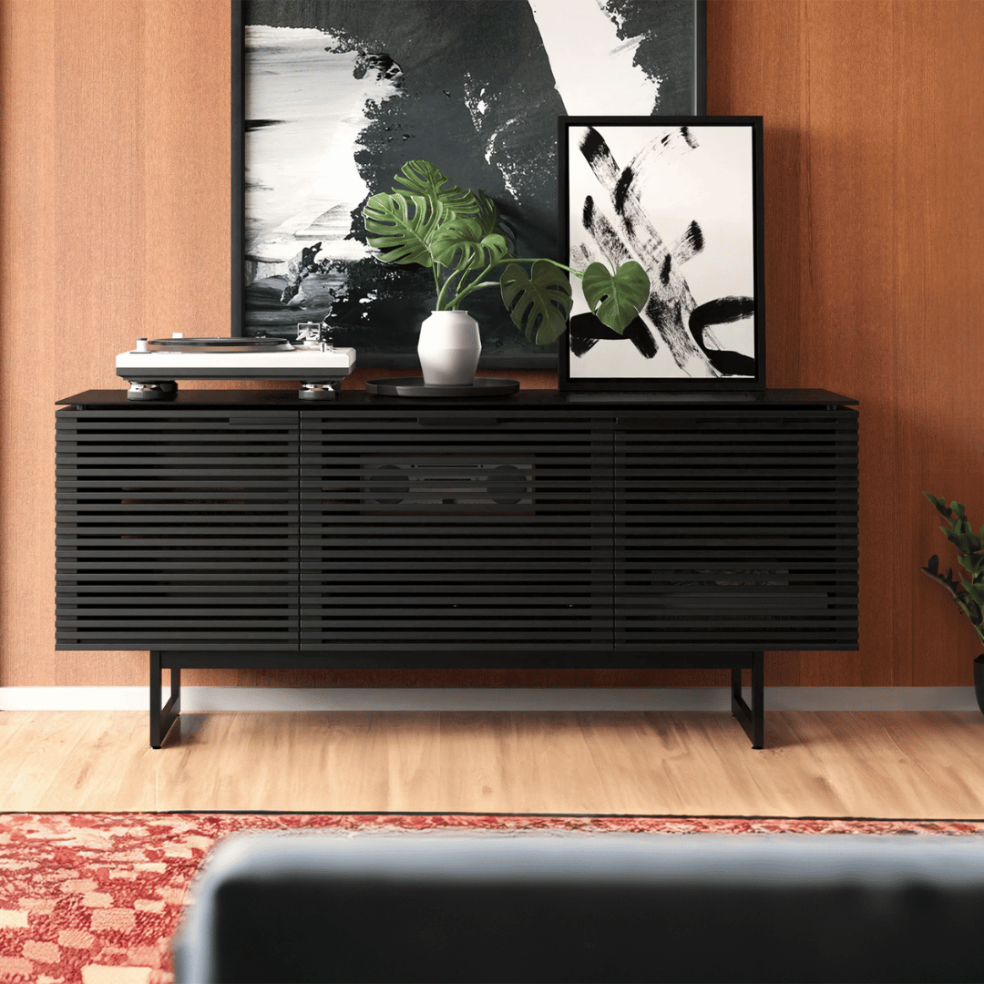 At 1660mm wide, this Corridor is designed for narrower spaces. This TV cabinet features louvered doors of solid timber that allow a speaker’s sound or a remote control’s signal to pass through unobstructed. It is three compartments wide, with a center drawer that pulls out to reveal a full-width soundbar speaker shelf and a media storage drawer. Finished in a black, micro-etched glass top and black steel legs with concealed wheels. Designed by audiophiles for audiophiles.