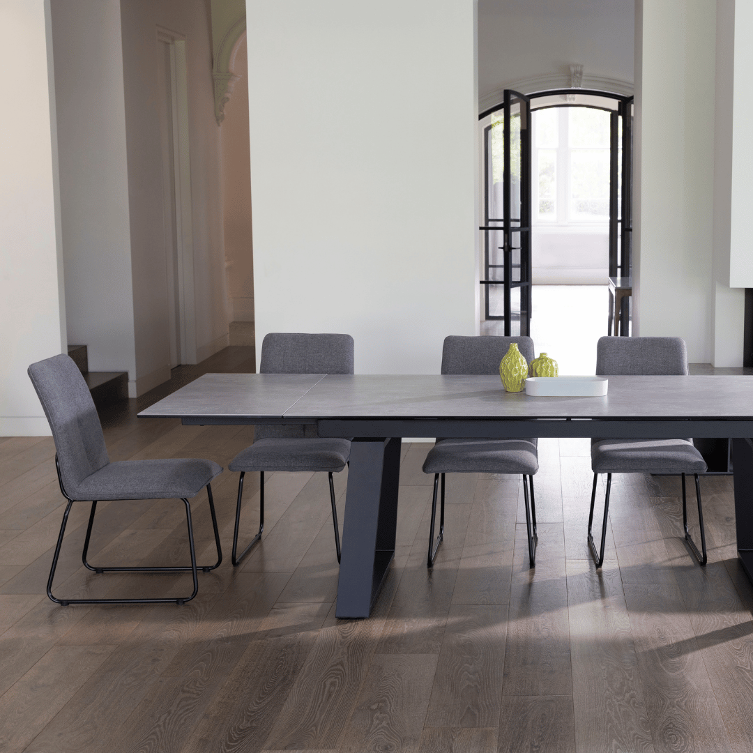 Make a statement in your dining room with the striking Corsica ceramic extension dining table. Constructed from powder-coated metal legs and a ceramic top, this durable and practical table will become the perfect companion within your dining space. The Corsica features a hidden double extension that transforms the length of the table from 2000mm to 3000mm, accommodating guests whenever needed. Finished in a grey stone-look ceramic, the style of the Corsica will lend itself to an array of different interior spaces.