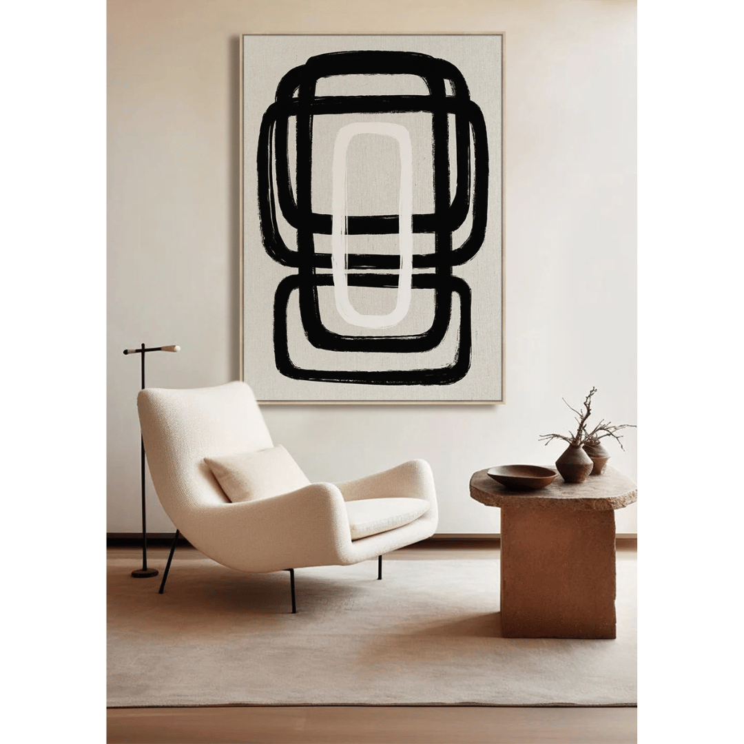 Welcome a modern and minimalist design into your home with the Harmonic framed canvas print. This hand-painted canvas print features bold curved lines and a muted colour scheme. The oversized dimensions will allow the Harmonic to become a focal point within any space, whilst the oak timber frame will enhance the abstract print.