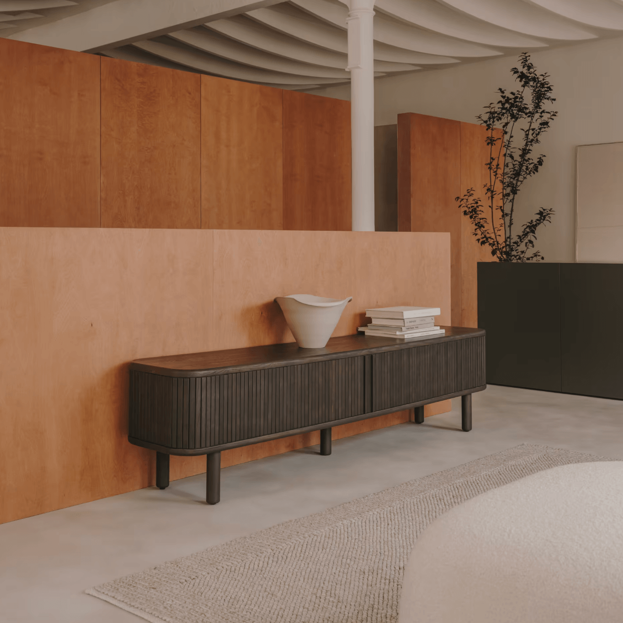 Say hello to the impressive Kevan entertainment cabinet. Featuring sliding tambour doors that are an innovative space saver because it doesn't swing out. The Kevan is made from ash wood and ash veneer in a dark finish. Inspired by the classic tambour-blind furniture of the 18th century in Europe, Kevan represents history, craftwork and long-lasting design. Incorporate effortless style into your living space with the Kevan entertainment cabinet. Pair with other pieces in the Kevan range.