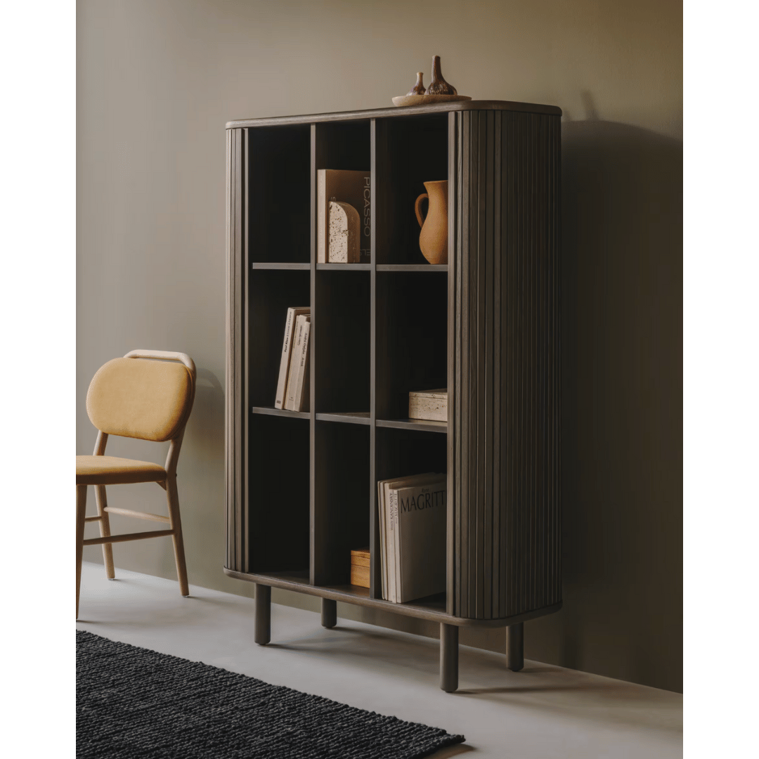 Say hello to the impressive Kevan storage cabinet. Featuring sliding tambour doors that are an innovative space saver because it doesn't swing out. Design highlights are the curved lines and 9 compartments for storage. The Kevan is made from ash wood and ash veneer in a dark finish. Inspired by the classic tambour-blind furniture of the 18th century in Europe, Kevan represents history, craftwork and long-lasting design. Incorporate effortless style into your living space with the Kevan storage cabinet. Pair with other pieces in the Kevan range.