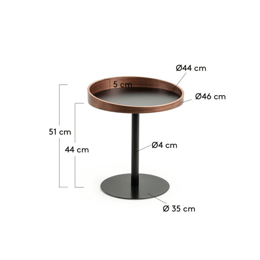 The Max side table's curved lip sets it apart from standard circular side tables. It adds visual interest and depth to the piece. The top is black melamine beautifully circled by walnut veneered plywood. The black powder coated metal leg and base will provide long term stability. The combination of timber and powder coated metal allow it to work in a variety of settings.