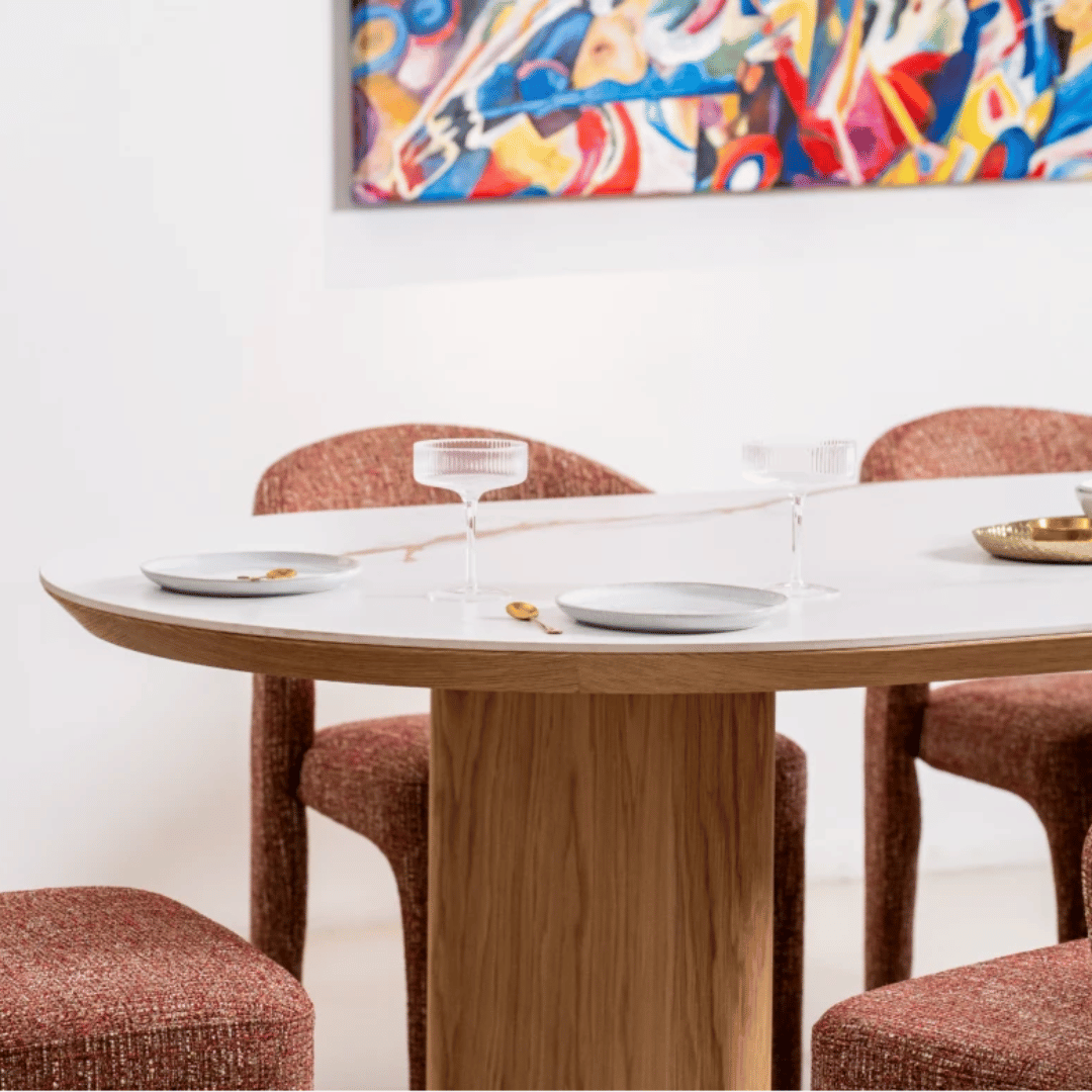 Enhance your dining space with the Mosi ceramic dining table. Made from a durable matte ceramic and Ash veneer, the Mosi is the perfect addition to any entertaining household. The feature legs add a touch of sophistication, whilst the patterned ceramic top combines natural beauty with modern elegance. This dining table is perfect for those seeking a balance of style and functionality.