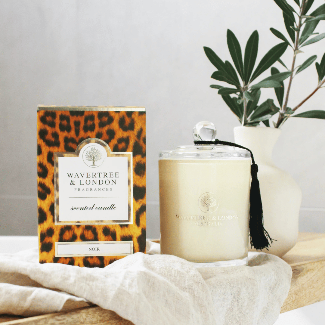 A seductive blend of rich berries, vanilla, cinnamon, amber, and a deep shadow of exotic woods and musk; the Noir candle will indulge the everyday. Triple scented for a longer lasting fragrance. Finished with a distinctive black tassel, and beautifully presented in a gift box.