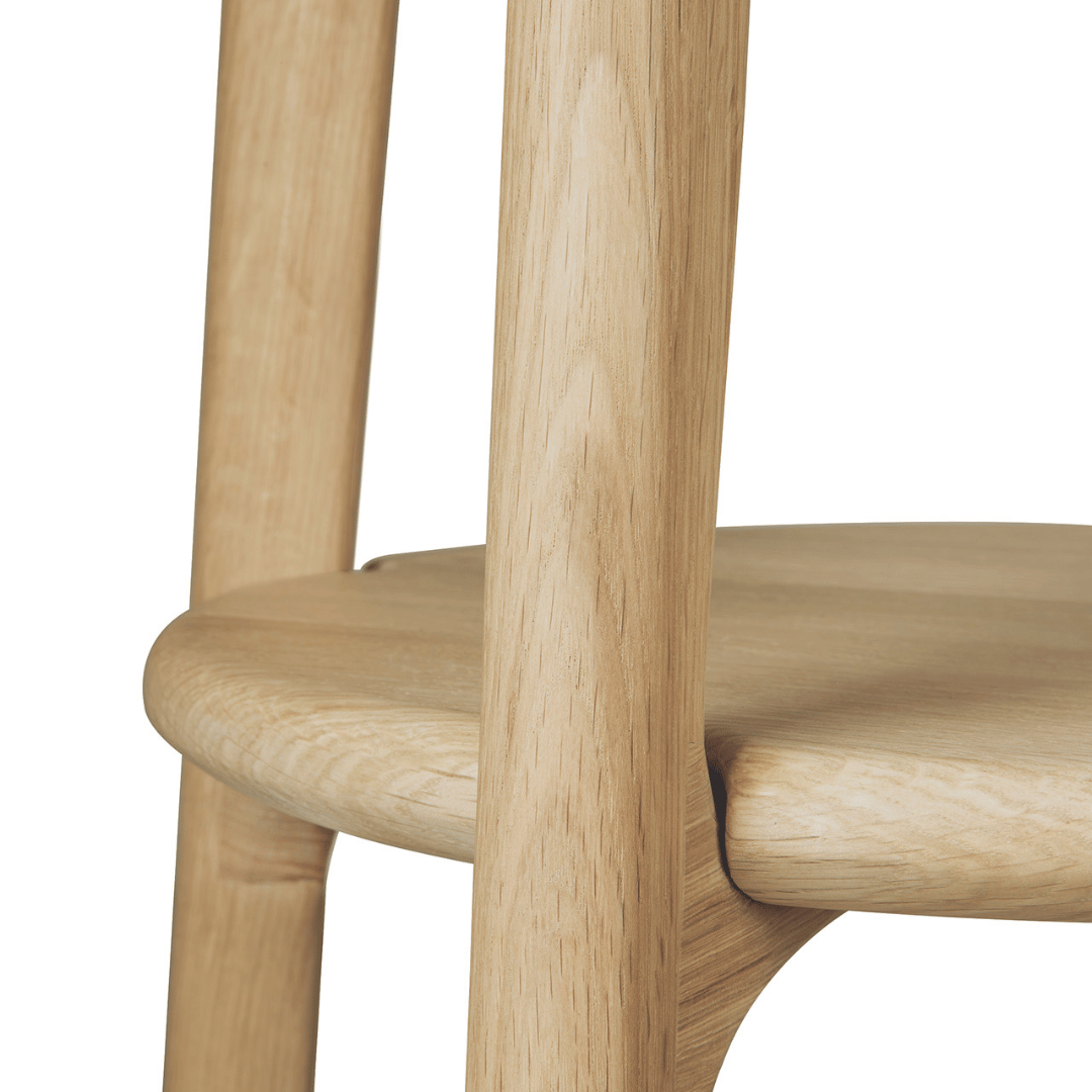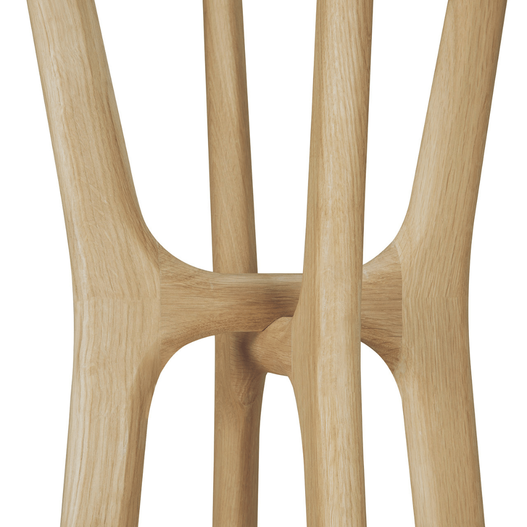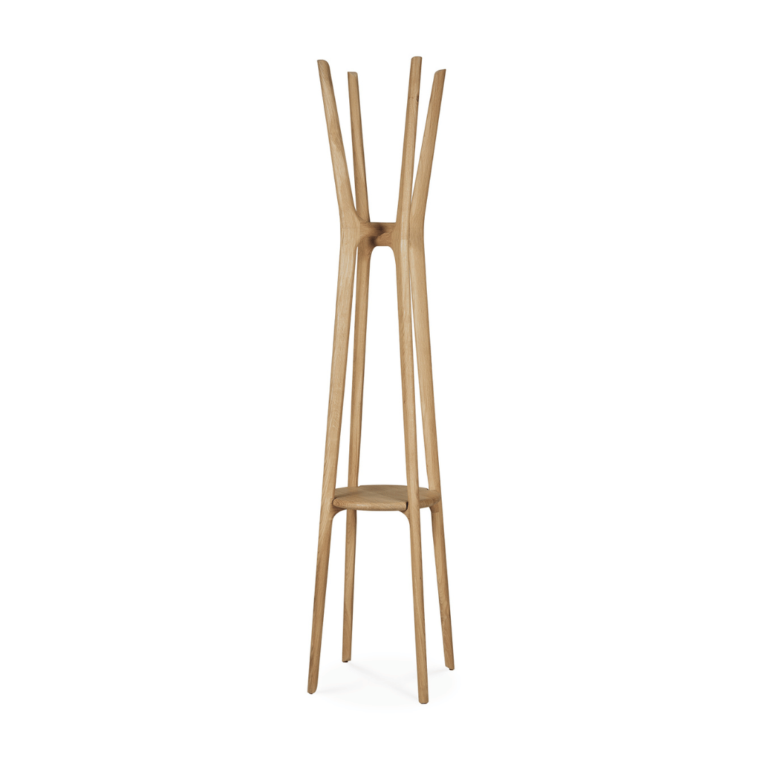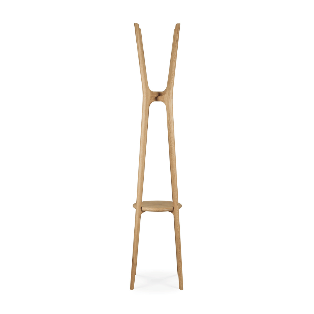 Elevate your entrance space with the sleek and modern PI coat stand. This design draws its inspiration from nature, featuring soft, gentle, curved, slim legs that intersect with the hidden shelf to create an elegant junction detail. Crafted from solid oak, this unique and statement coat stand is finished by and finish with a clear wax finish to enhance the timber's natural beauty..