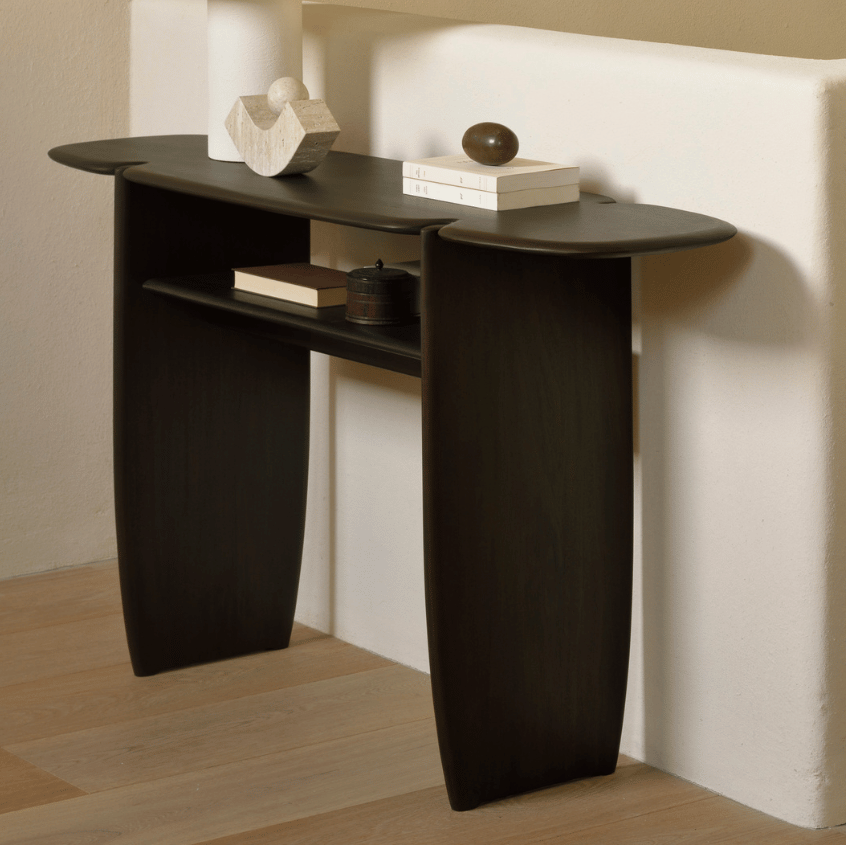 The organic silhouette of the PI console table complements any modern or contemporary space. Defined by the fluidic mahogany timber body, this design celebrates the beauty of natural timber. The dark varnished finish of the timber provides a beautiful Mid-century design. The PI offers the addition of a shelf, offering a stylish storage space.