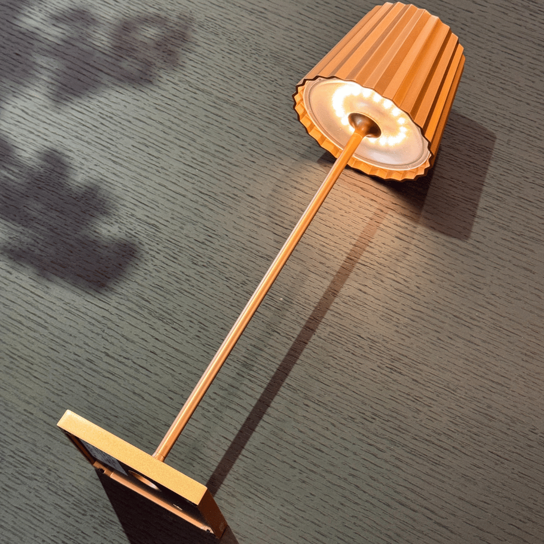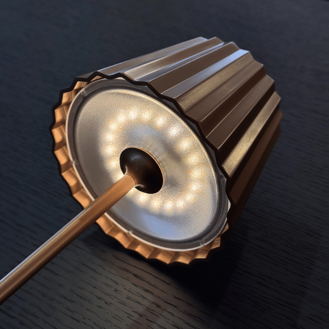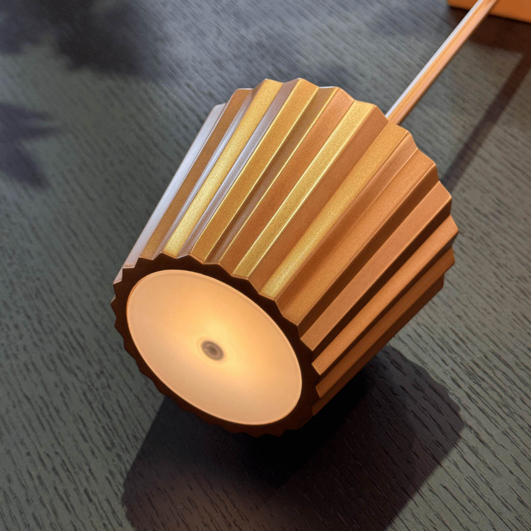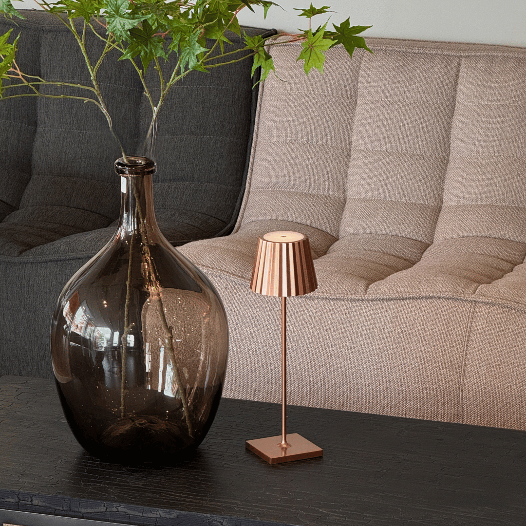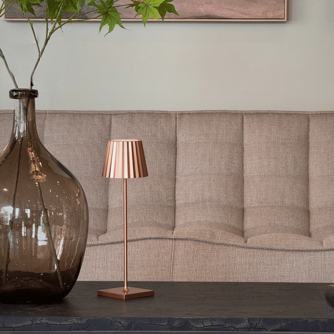 Introducing the Plisse LED Rechargeable Table Lamp, the perfect fusion of style and functionality to elevate any space. With its sleek pleat-like design and soft LED light, this lamp adds a retro touch of sophistication to your surroundings. Finished in a luxurious copper finish that is fingerprint resistant. Whether you're at home or on the go, experience ultimate control with the Plisse's soft dimming and two color temperature options. Customise the lighting to suit your mood or activity, whether you need bright and energising ambience, or a soft and warm glow. Suitable for both commercial and residential use.