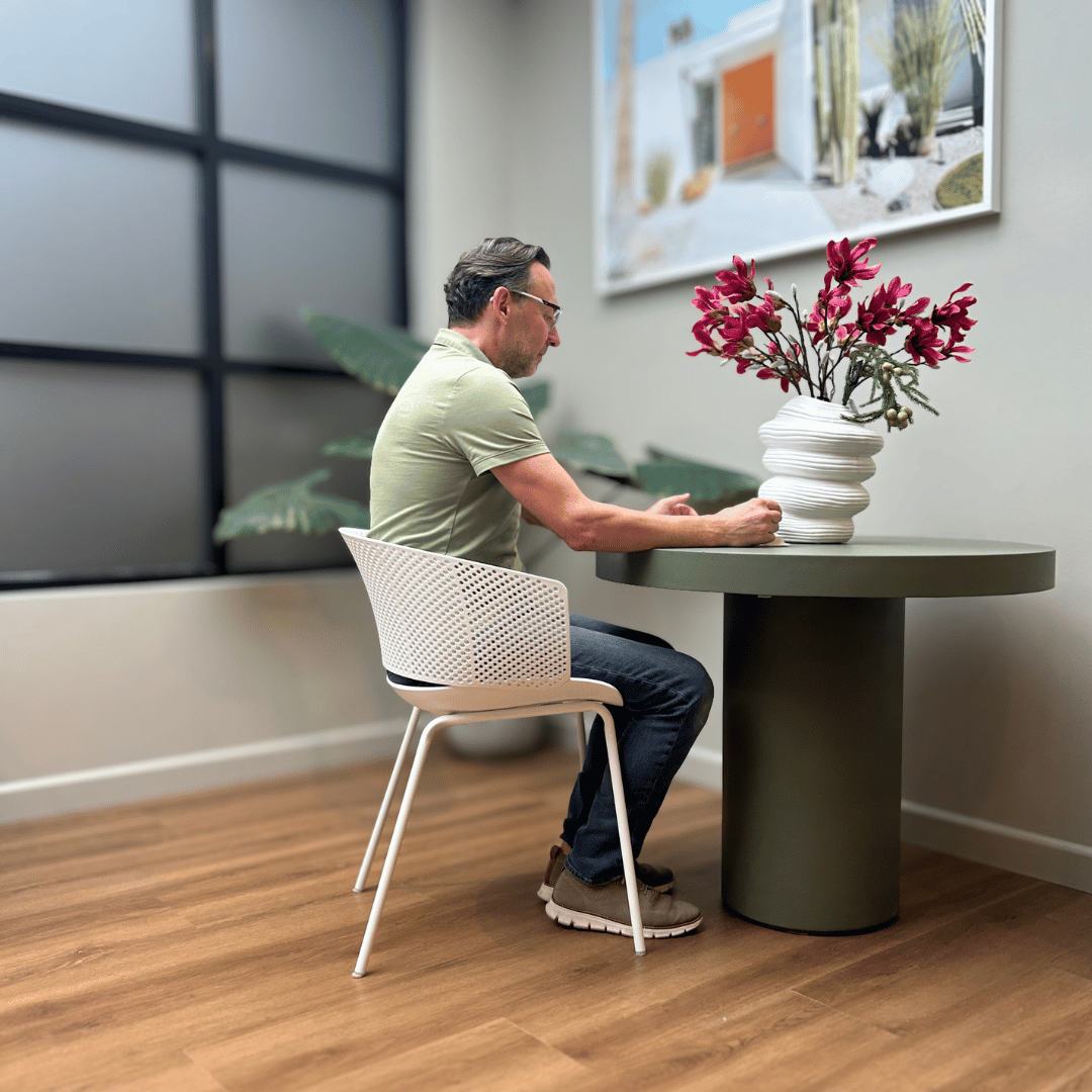 The Razona chair combines durability with contemporary design. Finished in a durable recyclable plastic, the perforated pattern allows air circulation and gives a visual lightness to the form. The beautifully curved seat has a slim profile and the matching colour steel legs with black plastic feet pads will deliver long term stability. The Razona is multipurpose and is perfect for indoor or outdoor use alike at home or for outdoor cafe chairs.