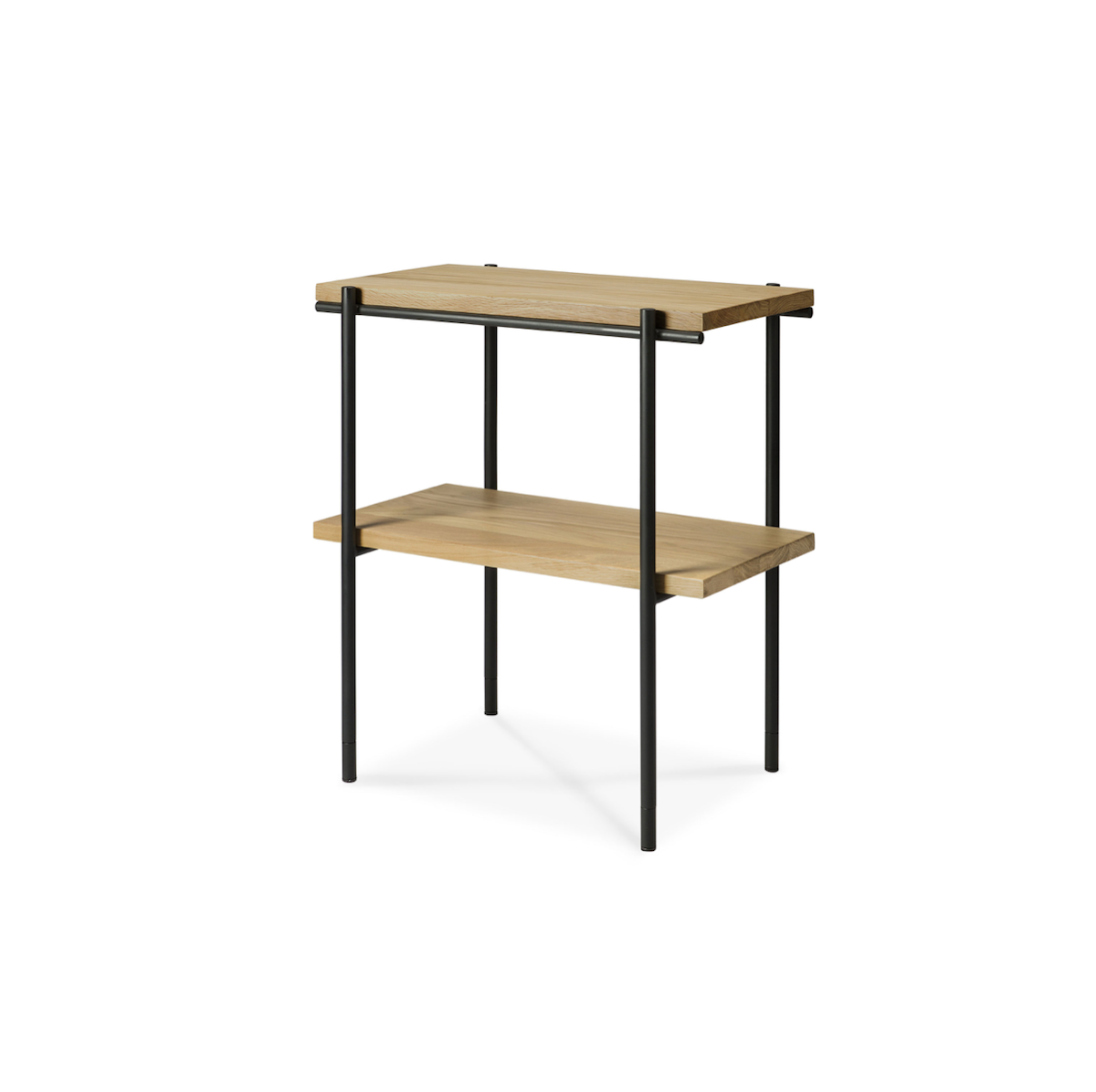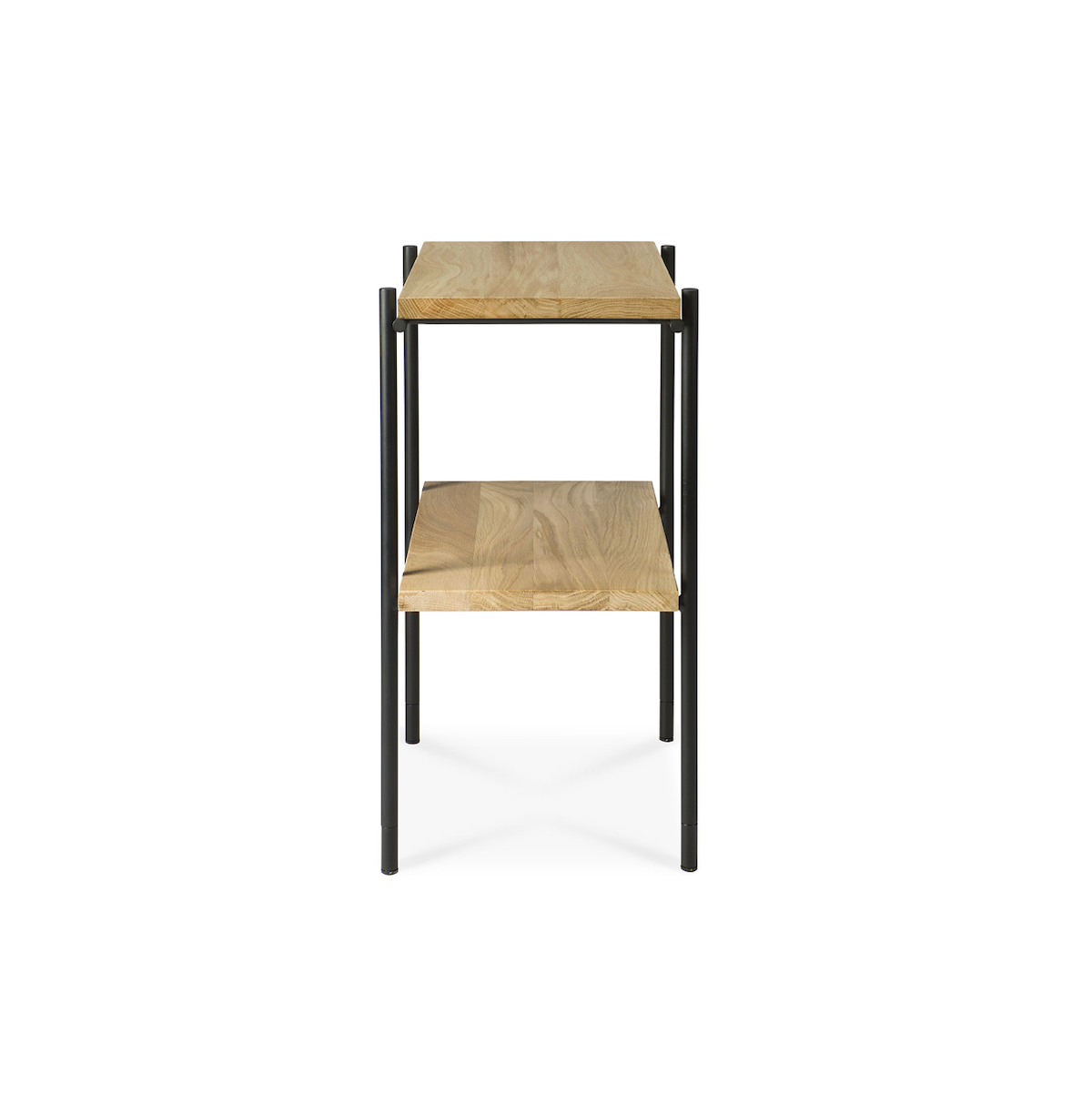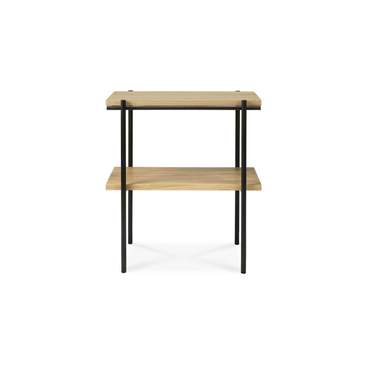 Elevate your living space with the Rise side table. Inspired by minimalistic architecture, this light modern design is crafted from a beautiful solid Oak and finished in a hardwax oil to express the individual characteristics of the timber. The slender metal frame sits elegantly with the Oak to create a delicate contrast between the two materials. This slim profile will fit perfectly in smaller spaces and adds extra storage with the lower shelf.