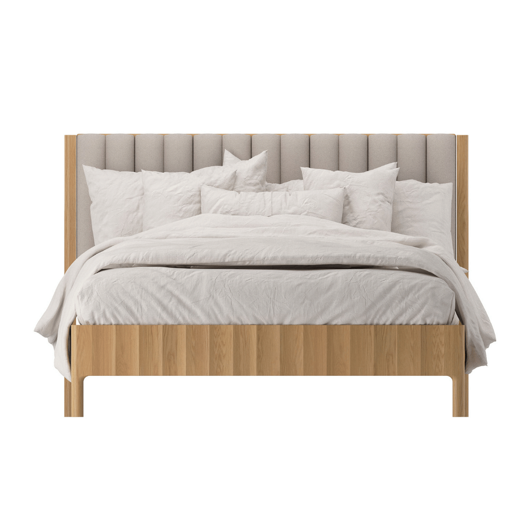 Welcome a natural and earthy design to your bedroom with the Stockholm bed. This sculptural bed will add visual interest to any space, with the glacier fabric headboard and natural American Oak frame. The balance of form and function makes it a versatile piece, adding a touch of luxury. As timber is a natural product, it is to be known that each piece will vary slightly in grain and colour.